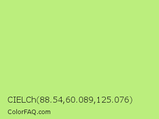 CIELCh 88.54,60.089,125.076 Color is a light green color and the nearest color is Sulu #c1f07c. Hex code #bbee7d and RGB value is rgb(187,238,125). In RGB color space, this color is composed of 73% red, 93% green, 49% blue, In CMYK color space, this color is composed of 21% cyan, 0% magenta, 47% yellow , 7% black , In HSL color space, this color has a hue angle of 87° , 77% saturation and 71% lightness.