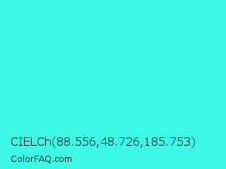 CIELCh 88.556,48.726,185.753 Color is a normal cyan color and the nearest color is Turquoise #40e0d0. Hex code #3df7e6 and RGB value is rgb(61,247,230). In RGB color space, this color is composed of 24% red, 97% green, 90% blue, In CMYK color space, this color is composed of 75% cyan, 0% magenta, 7% yellow , 3% black , In HSL color space, this color has a hue angle of 175° , 92% saturation and 60% lightness.