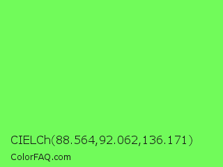 CIELCh 88.564,92.062,136.171 Color is a light green color and the nearest color is Screamin Green #66ff66. Hex code #71fb5a and RGB value is rgb(113,251,90). In RGB color space, this color is composed of 44% red, 98% green, 35% blue, In CMYK color space, this color is composed of 55% cyan, 0% magenta, 64% yellow , 2% black , In HSL color space, this color has a hue angle of 111° , 95% saturation and 67% lightness.