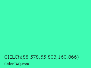 CIELCh 88.578,65.803,160.866 Color is a light green color and the nearest color is Eucalyptus #44d7a8. Hex code #3efbb3 and RGB value is rgb(62,251,179). In RGB color space, this color is composed of 24% red, 98% green, 70% blue, In CMYK color space, this color is composed of 75% cyan, 0% magenta, 29% yellow , 2% black , In HSL color space, this color has a hue angle of 157° , 96% saturation and 61% lightness.