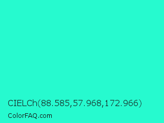 CIELCh 88.585,57.968,172.966 Color is a normal cyan color and the nearest color is Turquoise #40e0d0. Hex code #26facf and RGB value is rgb(38,250,207). In RGB color space, this color is composed of 15% red, 98% green, 81% blue, In CMYK color space, this color is composed of 85% cyan, 0% magenta, 17% yellow , 2% black , In HSL color space, this color has a hue angle of 168° , 95% saturation and 56% lightness.
