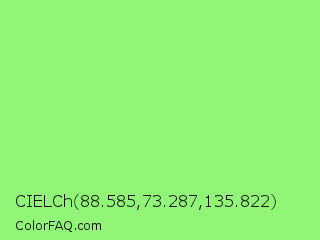 CIELCh 88.585,73.287,135.822 Color is a light green color and the nearest color is Light Green #90ee90. Hex code #91f678 and RGB value is rgb(145,246,120). In RGB color space, this color is composed of 57% red, 96% green, 47% blue, In CMYK color space, this color is composed of 41% cyan, 0% magenta, 51% yellow , 4% black , In HSL color space, this color has a hue angle of 108° , 88% saturation and 72% lightness.