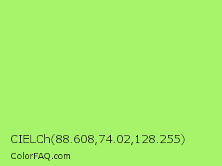 CIELCh 88.608,74.02,128.255 Color is a light green color and the nearest color is Inchworm #b2ec5d. Hex code #a7f369 and RGB value is rgb(167,243,105). In RGB color space, this color is composed of 65% red, 95% green, 41% blue, In CMYK color space, this color is composed of 31% cyan, 0% magenta, 57% yellow , 5% black , In HSL color space, this color has a hue angle of 93° , 85% saturation and 68% lightness.