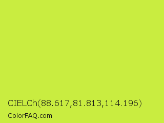 CIELCh 88.617,81.813,114.196 Color is a normal lime color and the nearest color is Pear #d1e231. Hex code #c9ed40 and RGB value is rgb(201,237,64). In RGB color space, this color is composed of 79% red, 93% green, 25% blue, In CMYK color space, this color is composed of 15% cyan, 0% magenta, 73% yellow , 7% black , In HSL color space, this color has a hue angle of 72° , 83% saturation and 59% lightness.