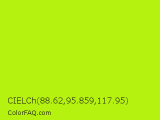 CIELCh 88.62,95.859,117.95 Color is a normal lime color and the nearest color is Inch Worm #b0e313. Hex code #b5f20f and RGB value is rgb(181,242,15). In RGB color space, this color is composed of 71% red, 95% green, 6% blue, In CMYK color space, this color is composed of 25% cyan, 0% magenta, 94% yellow , 5% black , In HSL color space, this color has a hue angle of 76° , 90% saturation and 50% lightness.
