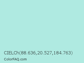 CIELCh 88.636,20.527,184.763 Color is a light cyan color and the nearest color is Cruise #b5ecdf. Hex code #afeae1 and RGB value is rgb(175,234,225). In RGB color space, this color is composed of 69% red, 92% green, 88% blue, In CMYK color space, this color is composed of 25% cyan, 0% magenta, 4% yellow , 8% black , In HSL color space, this color has a hue angle of 171° , 58% saturation and 80% lightness.