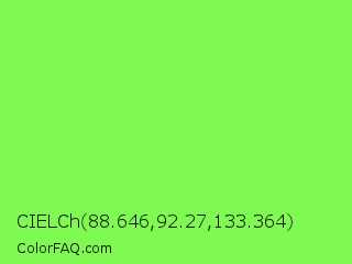 CIELCh 88.646,92.27,133.364 Color is a light green color and the nearest color is Screamin Green #66ff66. Hex code #7efa52 and RGB value is rgb(126,250,82). In RGB color space, this color is composed of 49% red, 98% green, 32% blue, In CMYK color space, this color is composed of 50% cyan, 0% magenta, 67% yellow , 2% black , In HSL color space, this color has a hue angle of 104° , 94% saturation and 65% lightness.