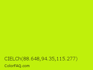 CIELCh 88.648,94.35,115.277 Color is a normal lime color and the nearest color is Las Palmas #c6e610. Hex code #bff00b and RGB value is rgb(191,240,11). In RGB color space, this color is composed of 75% red, 94% green, 4% blue, In CMYK color space, this color is composed of 20% cyan, 0% magenta, 95% yellow , 6% black , In HSL color space, this color has a hue angle of 73° , 91% saturation and 49% lightness.