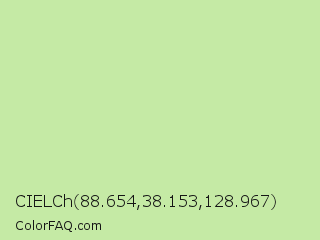 CIELCh 88.654,38.153,128.967 Color is a light green color and the nearest color is Reef #c9ffa2. Hex code #c5eaa5 and RGB value is rgb(197,234,165). In RGB color space, this color is composed of 77% red, 92% green, 65% blue, In CMYK color space, this color is composed of 16% cyan, 0% magenta, 29% yellow , 8% black , In HSL color space, this color has a hue angle of 92° , 62% saturation and 78% lightness.