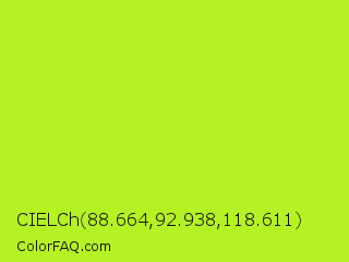CIELCh 88.664,92.938,118.611 Color is a normal lime color and the nearest color is Green Yellow #adff2f. Hex code #b5f224 and RGB value is rgb(181,242,36). In RGB color space, this color is composed of 71% red, 95% green, 14% blue, In CMYK color space, this color is composed of 25% cyan, 0% magenta, 85% yellow , 5% black , In HSL color space, this color has a hue angle of 78° , 89% saturation and 55% lightness.