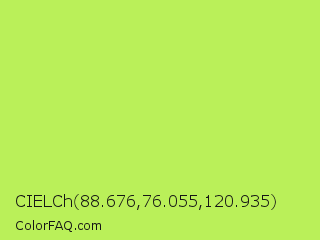 CIELCh 88.676,76.055,120.935 Color is a light green color and the nearest color is Inchworm #b2ec5d. Hex code #baf059 and RGB value is rgb(186,240,89). In RGB color space, this color is composed of 73% red, 94% green, 35% blue, In CMYK color space, this color is composed of 23% cyan, 0% magenta, 63% yellow , 6% black , In HSL color space, this color has a hue angle of 81° , 83% saturation and 65% lightness.