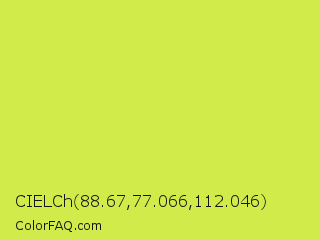 CIELCh 88.67,77.066,112.046 Color is a light yellow color and the nearest color is Maximum Green Yellow #d9e650. Hex code #d1eb4a and RGB value is rgb(209,235,74). In RGB color space, this color is composed of 82% red, 92% green, 29% blue, In CMYK color space, this color is composed of 11% cyan, 0% magenta, 69% yellow , 8% black , In HSL color space, this color has a hue angle of 70° , 80% saturation and 61% lightness.