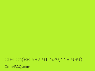 CIELCh 88.687,91.529,118.939 Color is a normal lime color and the nearest color is Green Lizard #a7f432. Hex code #b5f22b and RGB value is rgb(181,242,43). In RGB color space, this color is composed of 71% red, 95% green, 17% blue, In CMYK color space, this color is composed of 25% cyan, 0% magenta, 82% yellow , 5% black , In HSL color space, this color has a hue angle of 78° , 88% saturation and 56% lightness.