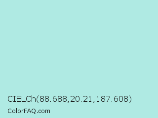 CIELCh 88.688,20.21,187.608 Color is a light cyan color and the nearest color is Cruise #b5ecdf. Hex code #afeae3 and RGB value is rgb(175,234,227). In RGB color space, this color is composed of 69% red, 92% green, 89% blue, In CMYK color space, this color is composed of 25% cyan, 0% magenta, 3% yellow , 8% black , In HSL color space, this color has a hue angle of 173° , 58% saturation and 80% lightness.