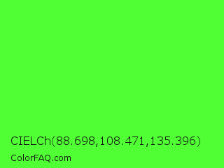 CIELCh 88.698,108.471,135.396 Color is a normal green color and the nearest color is Neon Green #39ff14. Hex code #51ff35 and RGB value is rgb(81,255,53). In RGB color space, this color is composed of 32% red, 100% green, 21% blue, In CMYK color space, this color is composed of 68% cyan, 0% magenta, 79% yellow , 0% black , In HSL color space, this color has a hue angle of 112° , 100% saturation and 60% lightness.