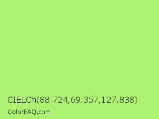 CIELCh 88.724,69.357,127.838 Color is a light green color and the nearest color is Inchworm #b2ec5d. Hex code #adf271 and RGB value is rgb(173,242,113). In RGB color space, this color is composed of 68% red, 95% green, 44% blue, In CMYK color space, this color is composed of 29% cyan, 0% magenta, 53% yellow , 5% black , In HSL color space, this color has a hue angle of 92° , 83% saturation and 70% lightness.