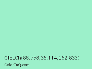CIELCh 88.758,35.114,162.833 Color is a light green color and the nearest color is Magic Mint #aaf0d1. Hex code #9cf0ca and RGB value is rgb(156,240,202). In RGB color space, this color is composed of 61% red, 94% green, 79% blue, In CMYK color space, this color is composed of 35% cyan, 0% magenta, 16% yellow , 6% black , In HSL color space, this color has a hue angle of 153° , 74% saturation and 78% lightness.