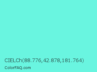 CIELCh 88.776,42.878,181.764 Color is a light cyan color and the nearest color is Aquamarine #7fffd4. Hex code #69f5e0 and RGB value is rgb(105,245,224). In RGB color space, this color is composed of 41% red, 96% green, 88% blue, In CMYK color space, this color is composed of 57% cyan, 0% magenta, 9% yellow , 4% black , In HSL color space, this color has a hue angle of 171° , 88% saturation and 69% lightness.