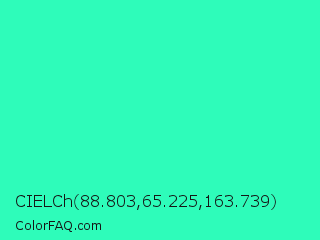 CIELCh 88.803,65.225,163.739 Color is a normal green color and the nearest color is Turquoise #40e0d0. Hex code #2efcba and RGB value is rgb(46,252,186). In RGB color space, this color is composed of 18% red, 99% green, 73% blue, In CMYK color space, this color is composed of 82% cyan, 0% magenta, 26% yellow , 1% black , In HSL color space, this color has a hue angle of 161° , 97% saturation and 58% lightness.