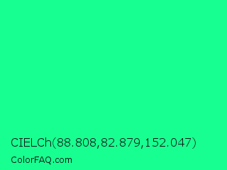 CIELCh 88.808,82.879,152.047 Color is a normal green color and the nearest color is Medium Spring Green #00fa9a. Hex code #18ff91 and RGB value is rgb(24,255,145). In RGB color space, this color is composed of 9% red, 100% green, 57% blue, In CMYK color space, this color is composed of 91% cyan, 0% magenta, 43% yellow , 0% black , In HSL color space, this color has a hue angle of 151° , 100% saturation and 55% lightness.