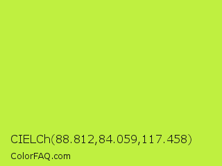 CIELCh 88.812,84.059,117.458 Color is a normal lime color and the nearest color is Pear #d1e231. Hex code #bff040 and RGB value is rgb(191,240,64). In RGB color space, this color is composed of 75% red, 94% green, 25% blue, In CMYK color space, this color is composed of 20% cyan, 0% magenta, 73% yellow , 6% black , In HSL color space, this color has a hue angle of 77° , 85% saturation and 60% lightness.