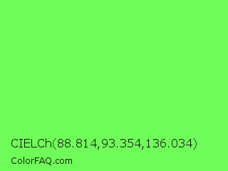 CIELCh 88.814,93.354,136.034 Color is a light green color and the nearest color is Screamin Green #66ff66. Hex code #70fc58 and RGB value is rgb(112,252,88). In RGB color space, this color is composed of 44% red, 99% green, 35% blue, In CMYK color space, this color is composed of 56% cyan, 0% magenta, 65% yellow , 1% black , In HSL color space, this color has a hue angle of 111° , 96% saturation and 67% lightness.