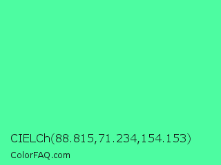 CIELCh 88.815,71.234,154.153 Color is a light green color and the nearest color is Eucalyptus #44d7a8. Hex code #4dfca1 and RGB value is rgb(77,252,161). In RGB color space, this color is composed of 30% red, 99% green, 63% blue, In CMYK color space, this color is composed of 69% cyan, 0% magenta, 36% yellow , 1% black , In HSL color space, this color has a hue angle of 149° , 97% saturation and 65% lightness.