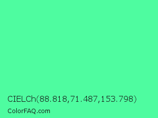 CIELCh 88.818,71.487,153.798 Color is a light green color and the nearest color is Very Light Malachite Green #64e986. Hex code #4efca0 and RGB value is rgb(78,252,160). In RGB color space, this color is composed of 31% red, 99% green, 63% blue, In CMYK color space, this color is composed of 69% cyan, 0% magenta, 37% yellow , 1% black , In HSL color space, this color has a hue angle of 148° , 97% saturation and 65% lightness.
