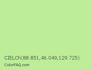 CIELCh 88.851,46.049,129.725 Color is a light green color and the nearest color is Reef #c9ffa2. Hex code #beed9a and RGB value is rgb(190,237,154). In RGB color space, this color is composed of 75% red, 93% green, 60% blue, In CMYK color space, this color is composed of 20% cyan, 0% magenta, 35% yellow , 7% black , In HSL color space, this color has a hue angle of 94° , 70% saturation and 77% lightness.