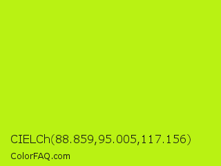 CIELCh 88.859,95.005,117.156 Color is a normal lime color and the nearest color is Inch Worm #b0e313. Hex code #b9f213 and RGB value is rgb(185,242,19). In RGB color space, this color is composed of 73% red, 95% green, 7% blue, In CMYK color space, this color is composed of 24% cyan, 0% magenta, 92% yellow , 5% black , In HSL color space, this color has a hue angle of 75° , 90% saturation and 51% lightness.