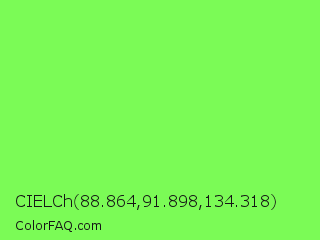 CIELCh 88.864,91.898,134.318 Color is a light green color and the nearest color is Screamin Green #66ff66. Hex code #7bfb56 and RGB value is rgb(123,251,86). In RGB color space, this color is composed of 48% red, 98% green, 34% blue, In CMYK color space, this color is composed of 51% cyan, 0% magenta, 66% yellow , 2% black , In HSL color space, this color has a hue angle of 107° , 95% saturation and 66% lightness.