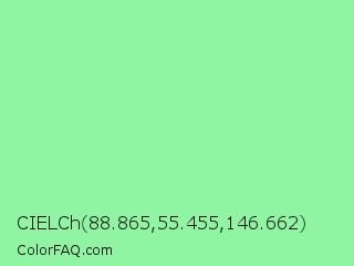 CIELCh 88.865,55.455,146.662 Color is a light green color and the nearest color is Pale Green #98fb98. Hex code #90f5a3 and RGB value is rgb(144,245,163). In RGB color space, this color is composed of 56% red, 96% green, 64% blue, In CMYK color space, this color is composed of 41% cyan, 0% magenta, 33% yellow , 4% black , In HSL color space, this color has a hue angle of 131° , 83% saturation and 76% lightness.