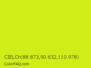 CIELCh 88.873,90.632,110.978 Color is a normal yellow color and the nearest color is Las Palmas #c6e610. Hex code #cfed17 and RGB value is rgb(207,237,23). In RGB color space, this color is composed of 81% red, 93% green, 9% blue, In CMYK color space, this color is composed of 13% cyan, 0% magenta, 90% yellow , 7% black , In HSL color space, this color has a hue angle of 68° , 86% saturation and 51% lightness.