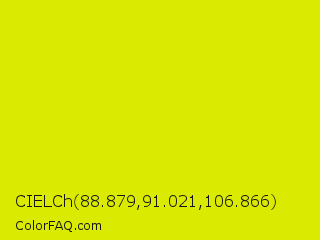 CIELCh 88.879,91.021,106.866 Color is a normal yellow color and the nearest color is Peridot #e6e200. Hex code #dbea01 and RGB value is rgb(219,234,1). In RGB color space, this color is composed of 86% red, 92% green, 0% blue, In CMYK color space, this color is composed of 6% cyan, 0% magenta, 100% yellow , 8% black , In HSL color space, this color has a hue angle of 64° , 99% saturation and 46% lightness.