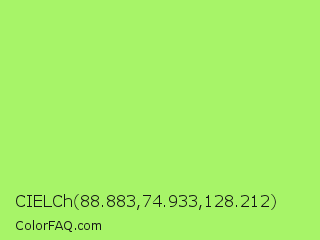 CIELCh 88.883,74.933,128.212 Color is a light green color and the nearest color is Inchworm #b2ec5d. Hex code #a7f468 and RGB value is rgb(167,244,104). In RGB color space, this color is composed of 65% red, 96% green, 41% blue, In CMYK color space, this color is composed of 32% cyan, 0% magenta, 57% yellow , 4% black , In HSL color space, this color has a hue angle of 93° , 86% saturation and 68% lightness.