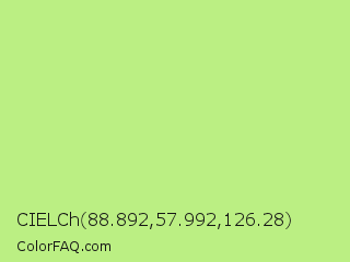 CIELCh 88.892,57.992,126.28 Color is a light green color and the nearest color is Sulu #c1f07c. Hex code #bbef83 and RGB value is rgb(187,239,131). In RGB color space, this color is composed of 73% red, 94% green, 51% blue, In CMYK color space, this color is composed of 22% cyan, 0% magenta, 45% yellow , 6% black , In HSL color space, this color has a hue angle of 89° , 77% saturation and 73% lightness.