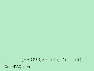 CIELCh 88.893,27.626,153.569 Color is a very light green color and the nearest color is Madang #b7f0be. Hex code #b5ecc7 and RGB value is rgb(181,236,199). In RGB color space, this color is composed of 71% red, 93% green, 78% blue, In CMYK color space, this color is composed of 23% cyan, 0% magenta, 16% yellow , 7% black , In HSL color space, this color has a hue angle of 140° , 59% saturation and 82% lightness.