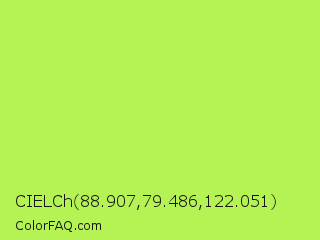 CIELCh 88.907,79.486,122.051 Color is a light green color and the nearest color is Inchworm #b2ec5d. Hex code #b5f254 and RGB value is rgb(181,242,84). In RGB color space, this color is composed of 71% red, 95% green, 33% blue, In CMYK color space, this color is composed of 25% cyan, 0% magenta, 65% yellow , 5% black , In HSL color space, this color has a hue angle of 83° , 86% saturation and 64% lightness.