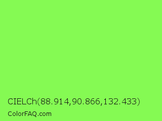 CIELCh 88.914,90.866,132.433 Color is a light green color and the nearest color is Kiwi #8ee53f. Hex code #85fa53 and RGB value is rgb(133,250,83). In RGB color space, this color is composed of 52% red, 98% green, 33% blue, In CMYK color space, this color is composed of 47% cyan, 0% magenta, 67% yellow , 2% black , In HSL color space, this color has a hue angle of 102° , 94% saturation and 65% lightness.