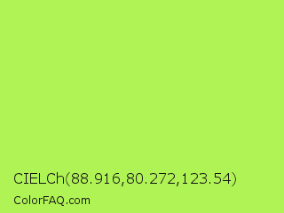 CIELCh 88.916,80.272,123.54 Color is a light green color and the nearest color is Inchworm #b2ec5d. Hex code #b0f355 and RGB value is rgb(176,243,85). In RGB color space, this color is composed of 69% red, 95% green, 33% blue, In CMYK color space, this color is composed of 28% cyan, 0% magenta, 65% yellow , 5% black , In HSL color space, this color has a hue angle of 85° , 87% saturation and 64% lightness.