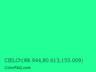 CIELCh 88.944,80.613,153.009 Color is a normal green color and the nearest color is Medium Spring Green #00fa9a. Hex code #21ff96 and RGB value is rgb(33,255,150). In RGB color space, this color is composed of 13% red, 100% green, 59% blue, In CMYK color space, this color is composed of 87% cyan, 0% magenta, 41% yellow , 0% black , In HSL color space, this color has a hue angle of 152° , 100% saturation and 56% lightness.