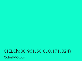 CIELCh 88.961,60.818,171.324 Color is a normal cyan color and the nearest color is Bright Turquoise #08e8de. Hex code #0ffccc and RGB value is rgb(15,252,204). In RGB color space, this color is composed of 6% red, 99% green, 80% blue, In CMYK color space, this color is composed of 94% cyan, 0% magenta, 19% yellow , 1% black , In HSL color space, this color has a hue angle of 168° , 98% saturation and 52% lightness.