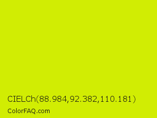 CIELCh 88.984,92.382,110.181 Color is a normal yellow color and the nearest color is Bitter Lemon #cae00d. Hex code #d1ed03 and RGB value is rgb(209,237,3). In RGB color space, this color is composed of 82% red, 93% green, 1% blue, In CMYK color space, this color is composed of 12% cyan, 0% magenta, 99% yellow , 7% black , In HSL color space, this color has a hue angle of 67° , 98% saturation and 47% lightness.