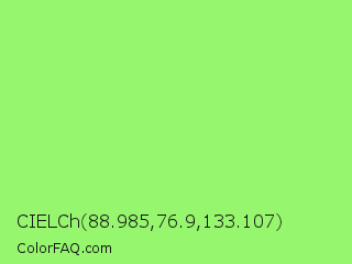 CIELCh 88.985,76.9,133.107 Color is a light green color and the nearest color is Inchworm #b2ec5d. Hex code #96f76e and RGB value is rgb(150,247,110). In RGB color space, this color is composed of 59% red, 97% green, 43% blue, In CMYK color space, this color is composed of 39% cyan, 0% magenta, 55% yellow , 3% black , In HSL color space, this color has a hue angle of 102° , 90% saturation and 70% lightness.