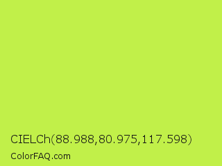 CIELCh 88.988,80.975,117.598 Color is a light lime color and the nearest color is Inchworm #b2ec5d. Hex code #c1f049 and RGB value is rgb(193,240,73). In RGB color space, this color is composed of 76% red, 94% green, 29% blue, In CMYK color space, this color is composed of 20% cyan, 0% magenta, 70% yellow , 6% black , In HSL color space, this color has a hue angle of 77° , 85% saturation and 61% lightness.
