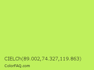CIELCh 89.002,74.327,119.863 Color is a light green color and the nearest color is Inchworm #b2ec5d. Hex code #bff05c and RGB value is rgb(191,240,92). In RGB color space, this color is composed of 75% red, 94% green, 36% blue, In CMYK color space, this color is composed of 20% cyan, 0% magenta, 62% yellow , 6% black , In HSL color space, this color has a hue angle of 80° , 83% saturation and 65% lightness.