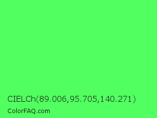 CIELCh 89.006,95.705,140.271 Color is a light green color and the nearest color is Screamin Green #66ff66. Hex code #52ff61 and RGB value is rgb(82,255,97). In RGB color space, this color is composed of 32% red, 100% green, 38% blue, In CMYK color space, this color is composed of 68% cyan, 0% magenta, 62% yellow , 0% black , In HSL color space, this color has a hue angle of 125° , 100% saturation and 66% lightness.