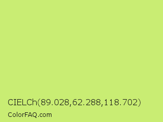 CIELCh 89.028,62.288,118.702 Color is a light lime color and the nearest color is Sulu #c1f07c. Hex code #c9ed73 and RGB value is rgb(201,237,115). In RGB color space, this color is composed of 79% red, 93% green, 45% blue, In CMYK color space, this color is composed of 15% cyan, 0% magenta, 51% yellow , 7% black , In HSL color space, this color has a hue angle of 78° , 77% saturation and 69% lightness.