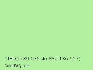 CIELCh 89.036,46.882,136.957 Color is a light green color and the nearest color is Granny Smith Apple #a8e4a0. Hex code #b1f0a1 and RGB value is rgb(177,240,161). In RGB color space, this color is composed of 69% red, 94% green, 63% blue, In CMYK color space, this color is composed of 26% cyan, 0% magenta, 33% yellow , 6% black , In HSL color space, this color has a hue angle of 108° , 72% saturation and 79% lightness.