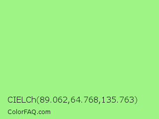 CIELCh 89.062,64.768,135.763 Color is a light green color and the nearest color is Light Green #90ee90. Hex code #9ef586 and RGB value is rgb(158,245,134). In RGB color space, this color is composed of 62% red, 96% green, 53% blue, In CMYK color space, this color is composed of 36% cyan, 0% magenta, 45% yellow , 4% black , In HSL color space, this color has a hue angle of 107° , 85% saturation and 74% lightness.